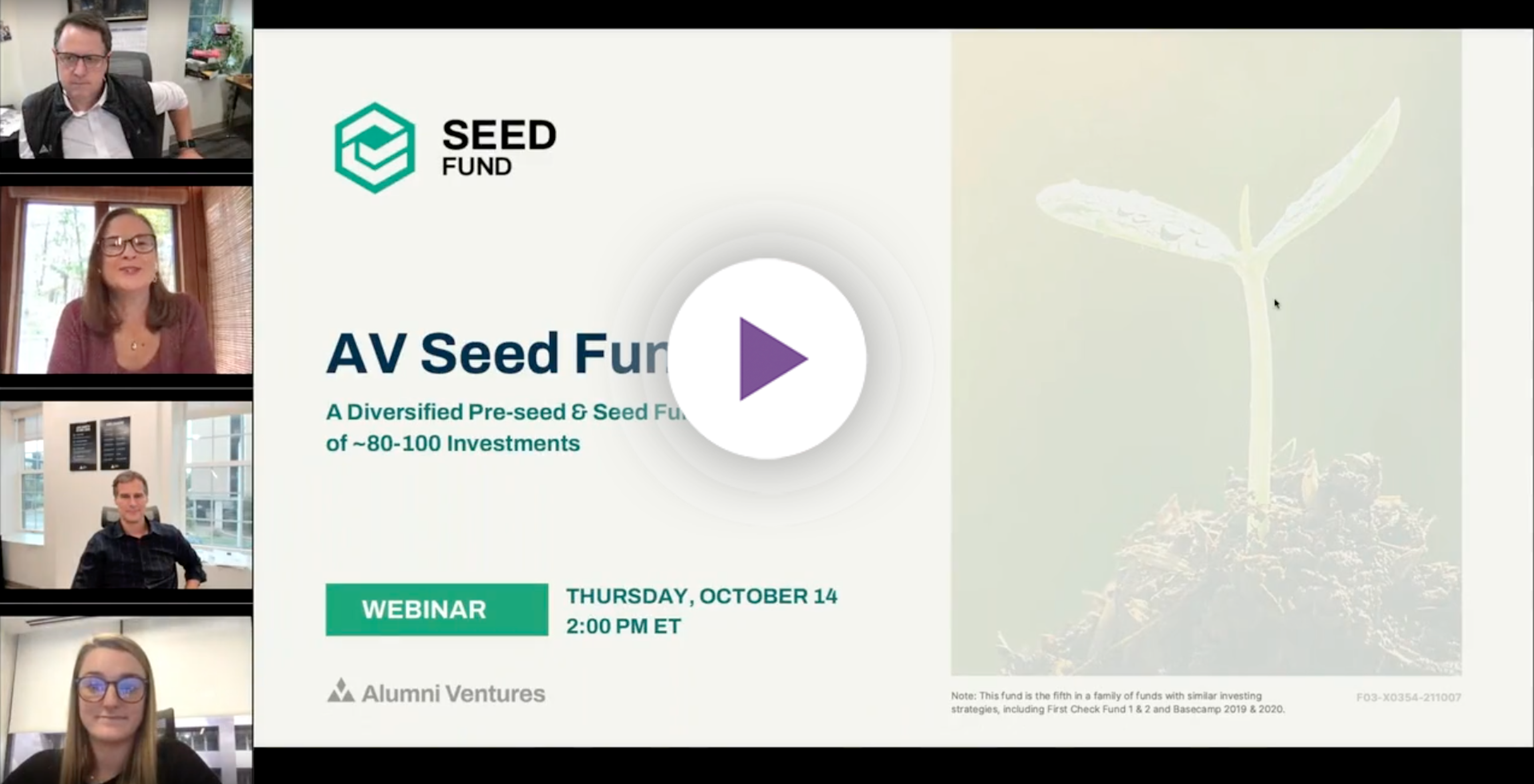 Watch our on-demand 45-minute presentation about Alumni Ventures’ Seed Fund, our seed and pre-seed focused venture capital fund.