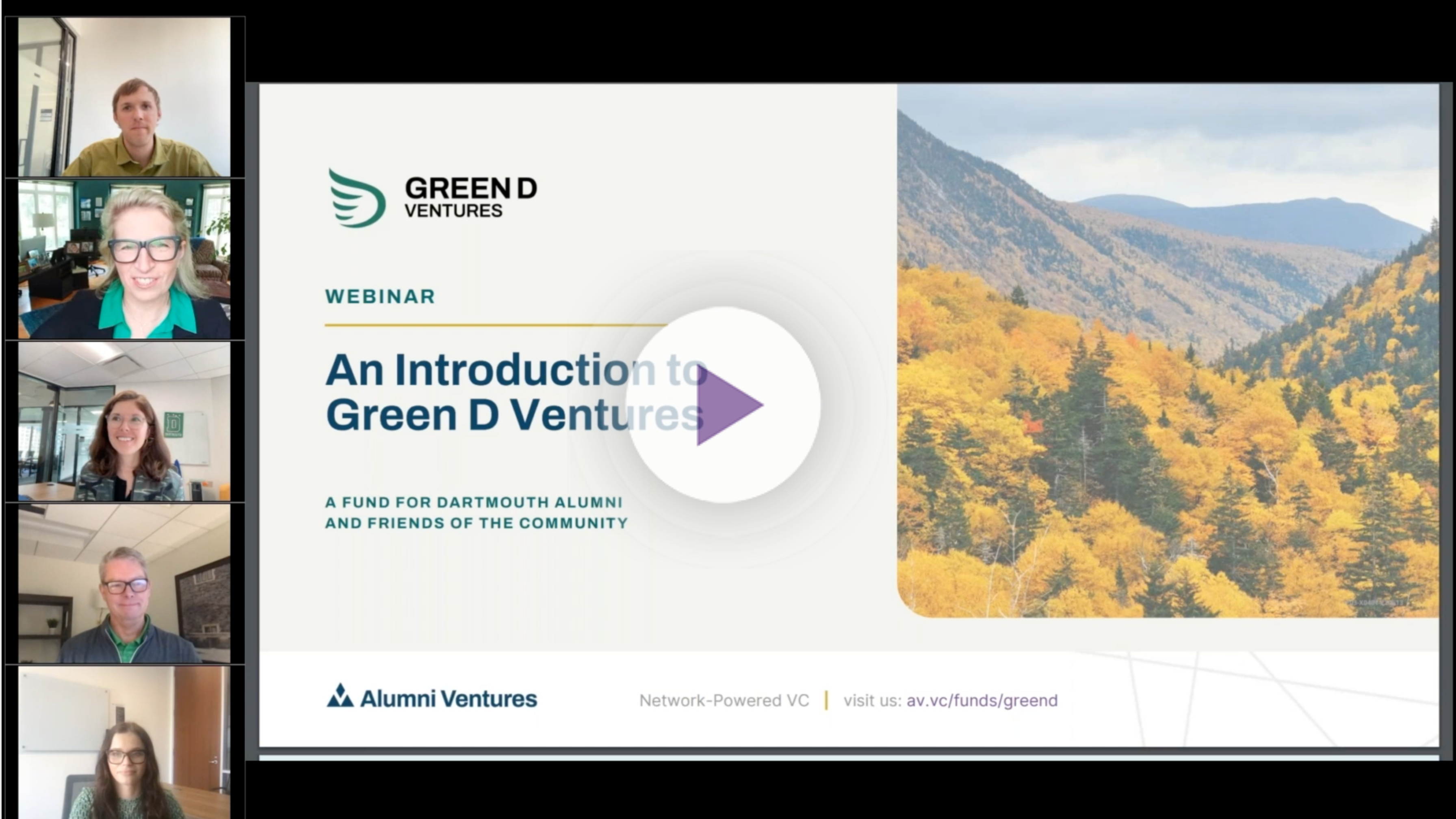 Watch our on-demand, 40-minute presentation about Green D Ventures, Alumni Ventures’ fund for Dartmouth alumni and friends of the community.