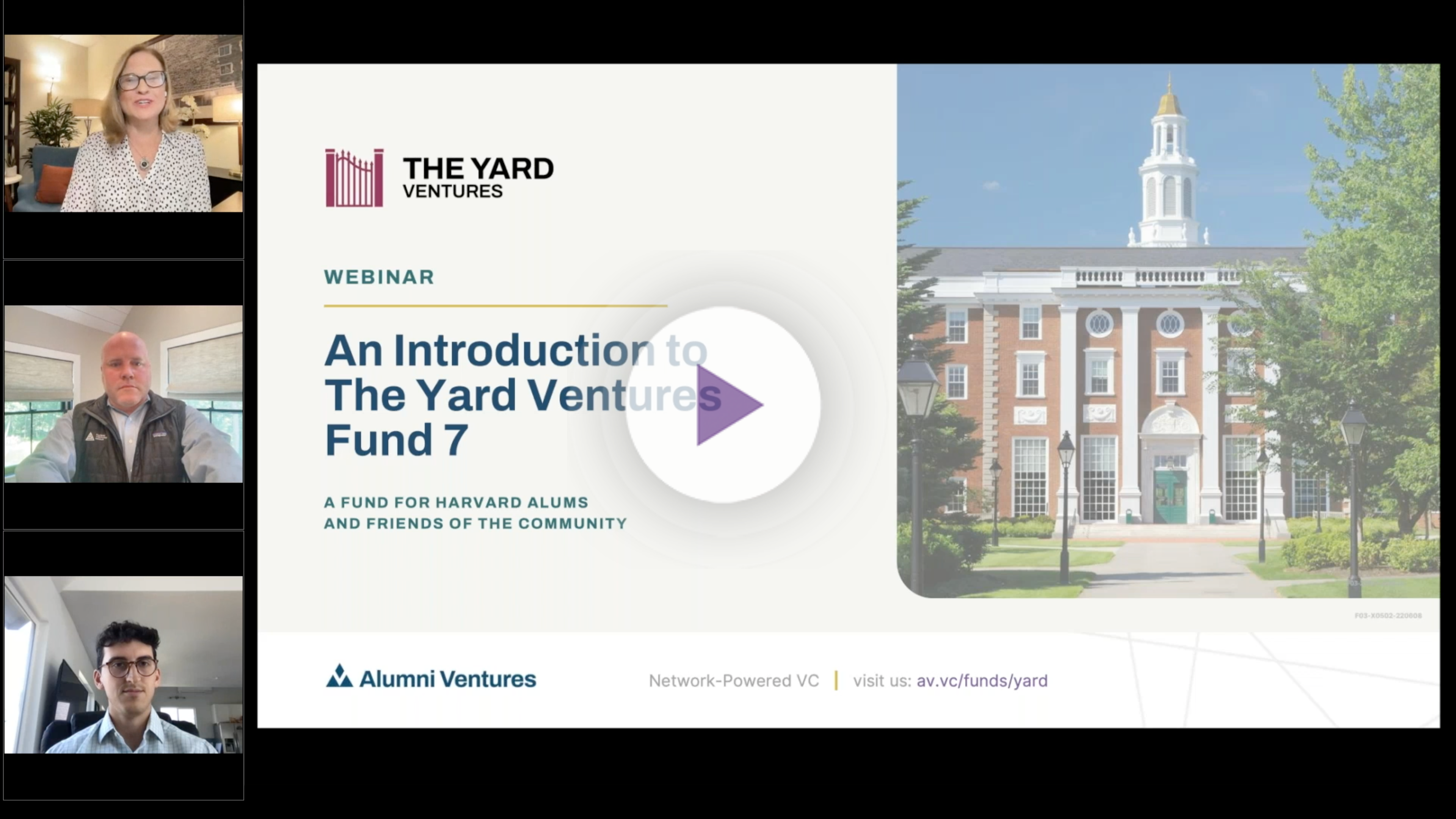 Watch a replay of our 30-minute session introducing The Yard Ventures and the launch of Fund 7. The Yard Ventures is Alumni Ventures’ fund for Harvard alums and friends of the community.