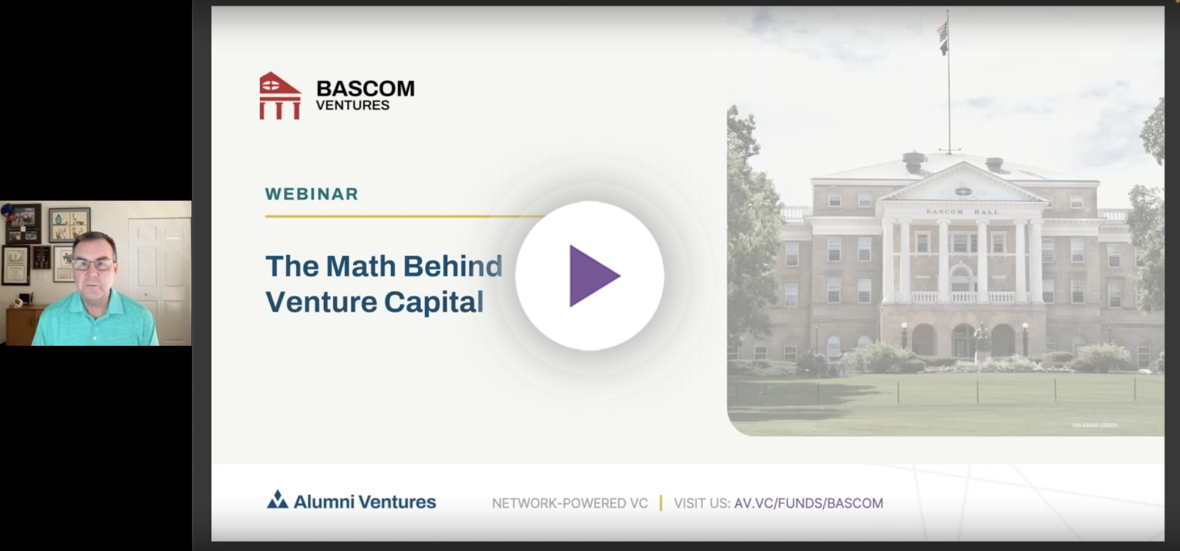 Watch a short, 10-minute snippet of our presentation about the math behind venture capital, led by Bascom Ventures’ Managing Partner Greg Baker. Bascom Ventures is Alumni Ventures’ Wisconsin-focused venture capital fund, and this webinar is open to all alumni and friends of the University of Wisconsin.