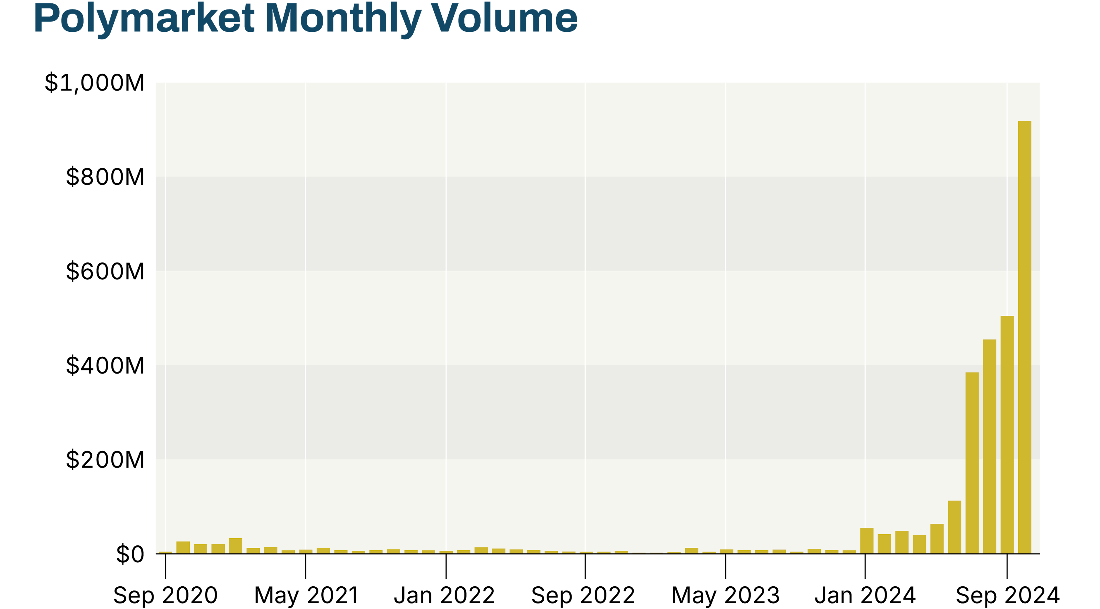 SOURCE: Richard Chen on Dune.com via Bitcoin.com, “Polymarket Volume Hits Record $917M in October – How Much Higher Could It Go?”, AICoin.com, October 2024, accessed December 4, 2024.