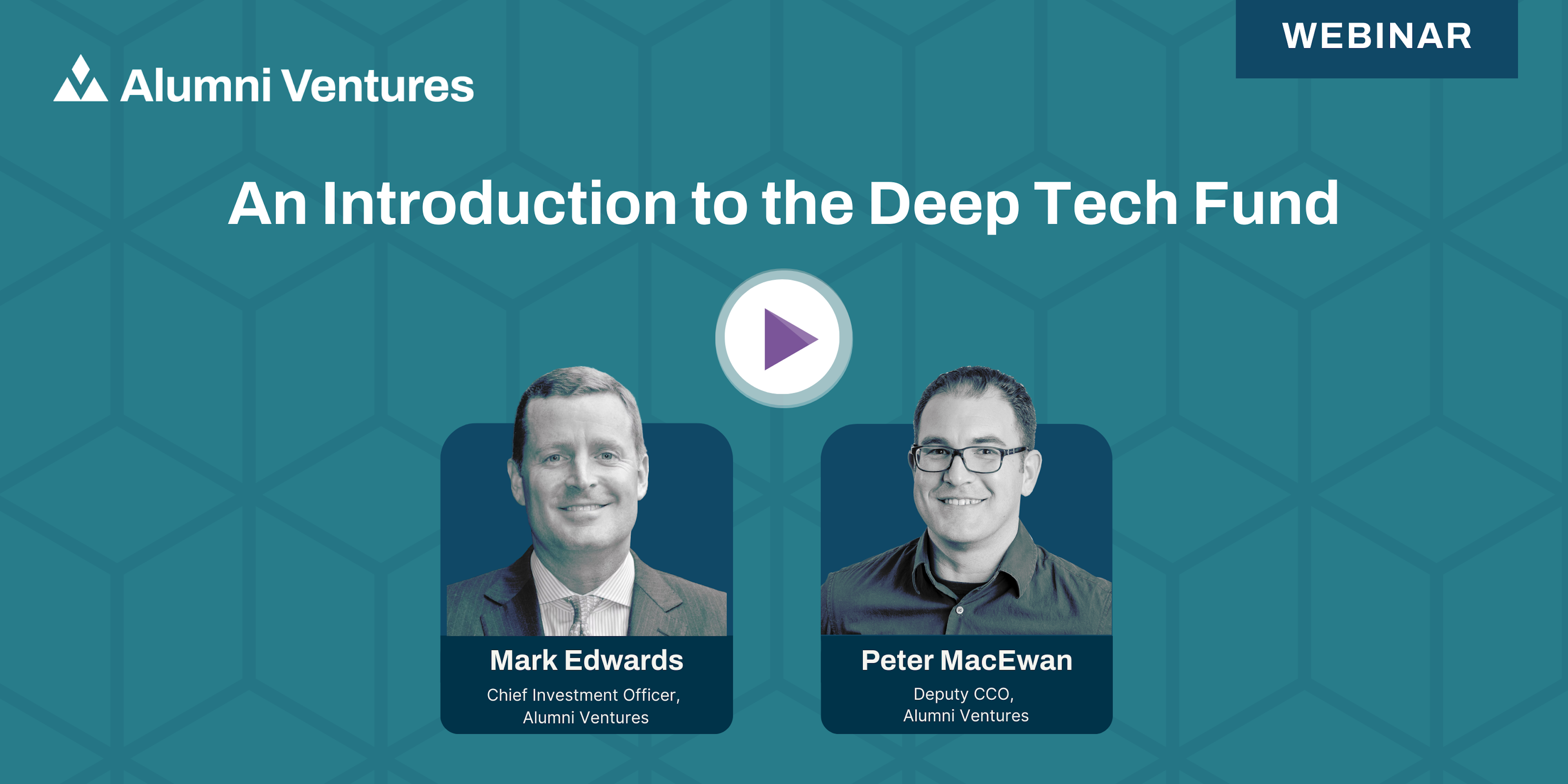Watch this on-demand 45-minute presentation about Alumni Ventures’ Deep Tech fund and how individual accredited investors can gain access to a portfolio of 20-30 startups focused on solving some of the world’s biggest challenges using Deep Tech.