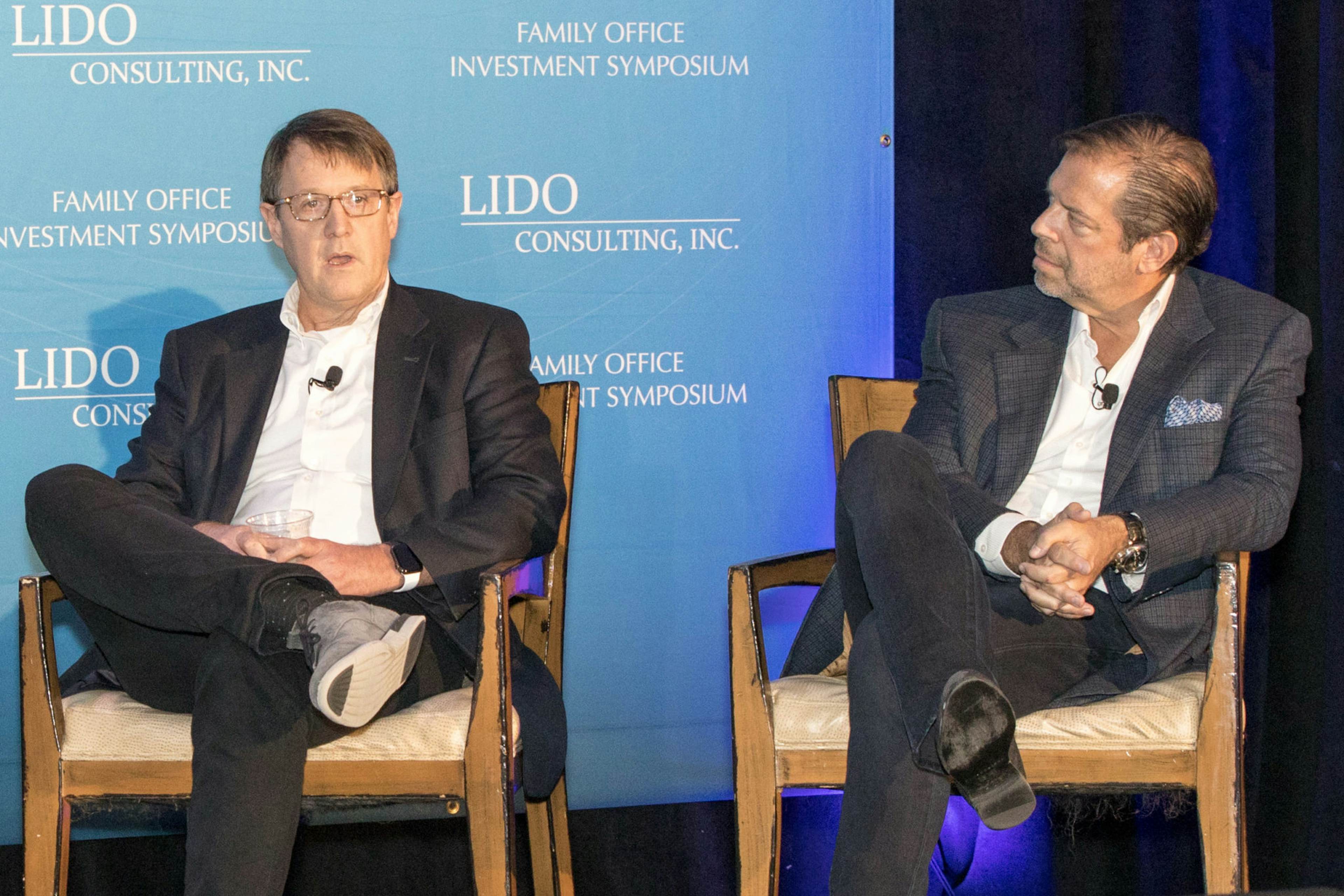 Bottom (L-R): Mike speaking at a Lido Advisors Investment Symposium with Andre de Baubigny, Managing Partner of AVG’s Spike Ventures fund for Stanford alums. (Source: AVG)