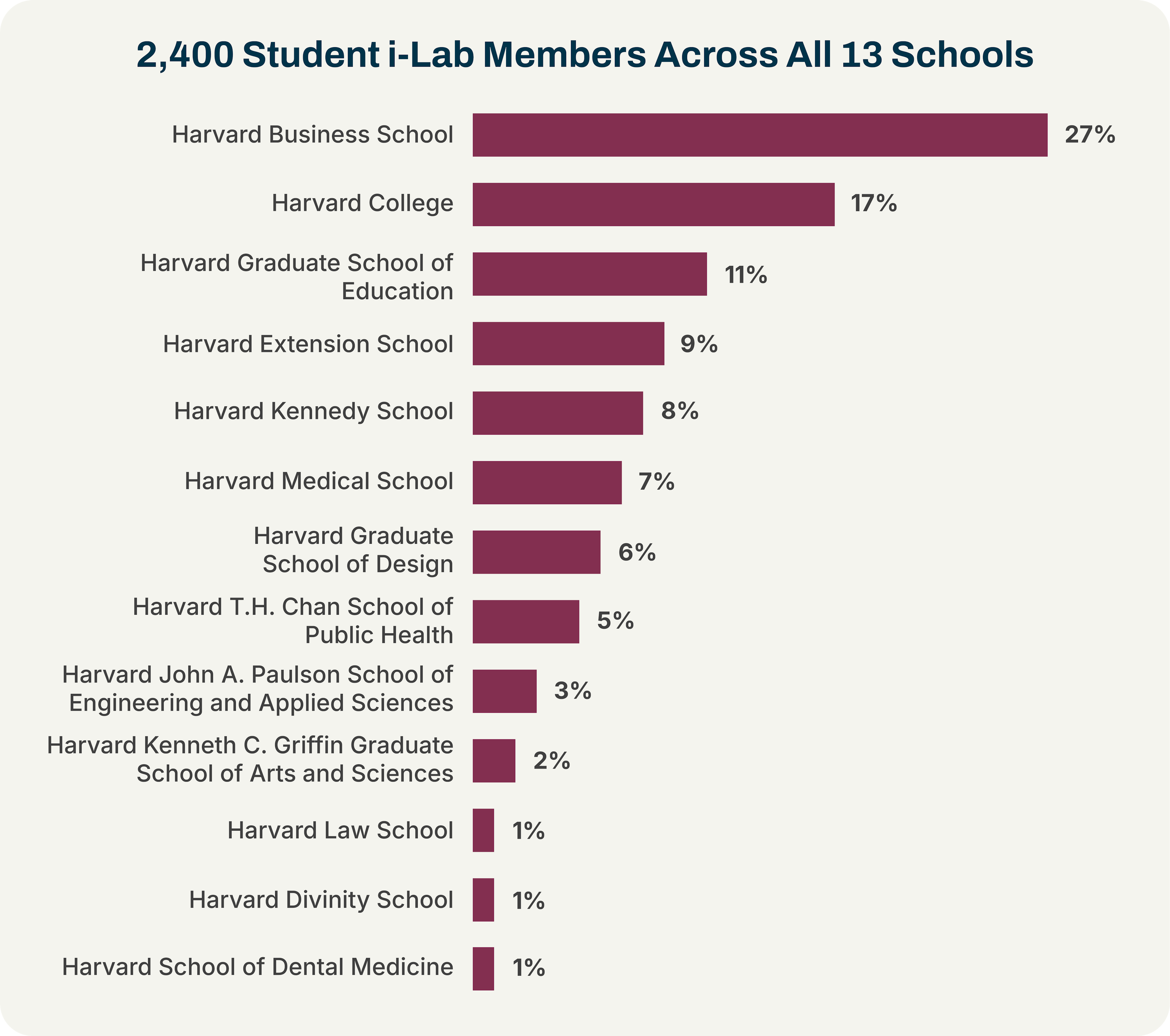 Then all schools converge at the Harvard Innovation Labs. Since opening in 2011, the i-labs have supported more than 6,500 ventures that have collectively raised more than $9 billion. Participation is large and increasing. During the 2024-2025 academic year, more than 2,900 students from all 13 Harvard schools joined the Harvard Innovation Labs, representing roughly one in nine degree-seeking students at the university*. From the i-labs, founders move into more specialized environments. Launch Lab X supports alumni-led ventures as they transition from formation to scale. The Pagliuca Harvard Life Lab provides wet-lab space and resources designed for early-stage life sciences companies, like Vaxess Technologies we mentioned before..