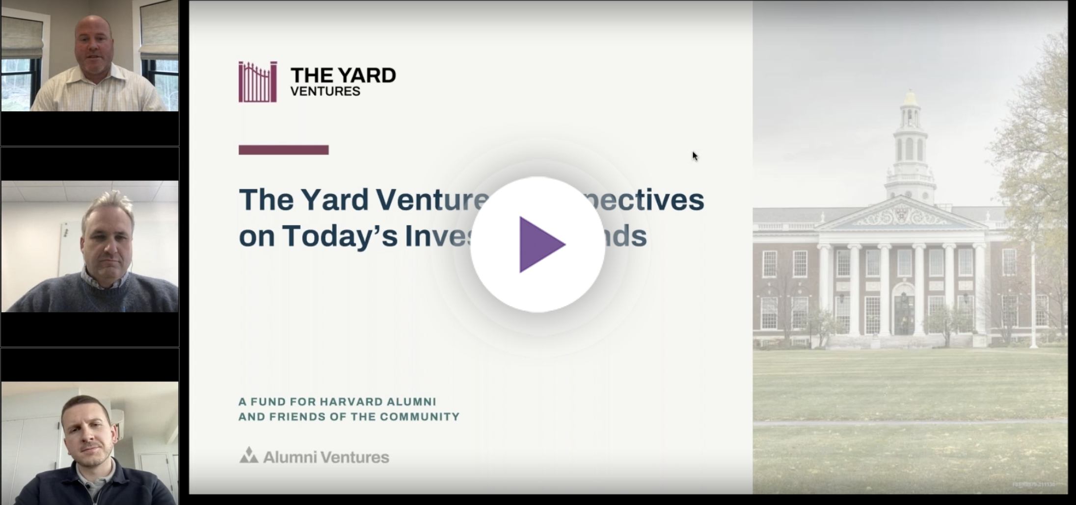 The session is led by The Yard Ventures’ Managing Partner Michael Madden, Partner Ron Levin, and Senior Associate Grant Demeter. This presentation is open to all alumni and friends of Harvard.