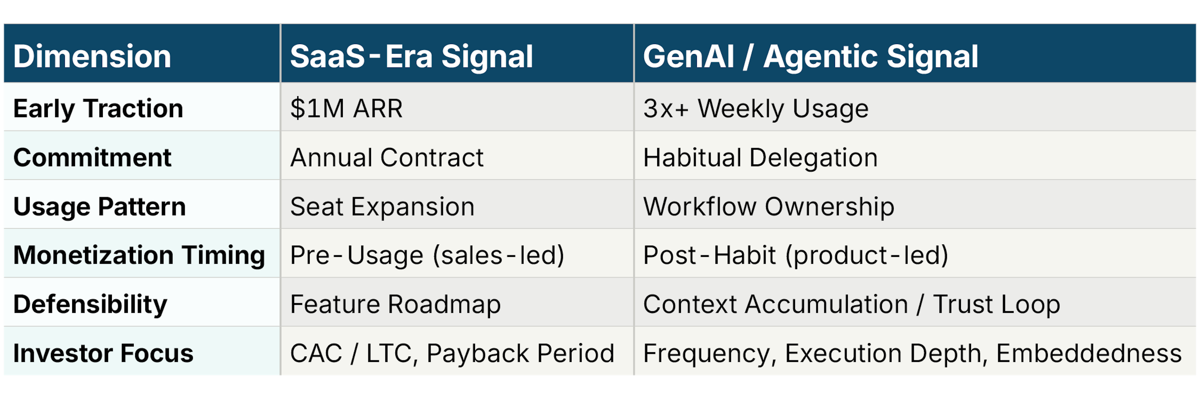 The shift from SaaS to AI-native products doesn’t just change how users behave, it changes how investors evaluate traction. Here’s how the old signals compare to what matters now: