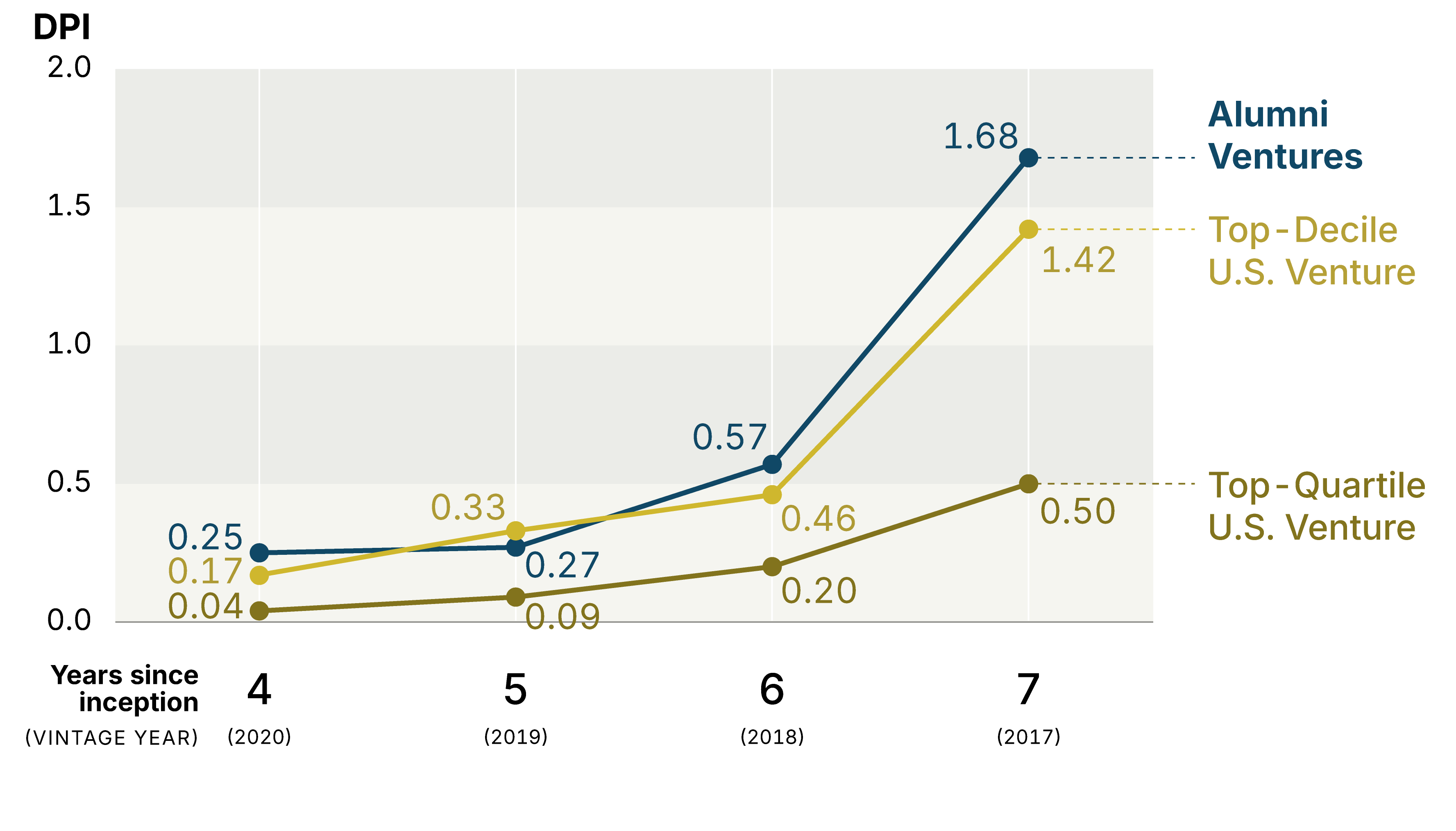 NOTE: Graph compares Alumni Ventures’ 2017–2020 fund vintages against peer group data published by Carta. Performance shown is Distributions to Paid-in Capital, which is Amounts Returned to Investors / Paid-in Capital, and is net of all applicable fees. Carta data is available here. Performance as of 12/31/24. For information on the performance of all AV fund vintages, please see here.
