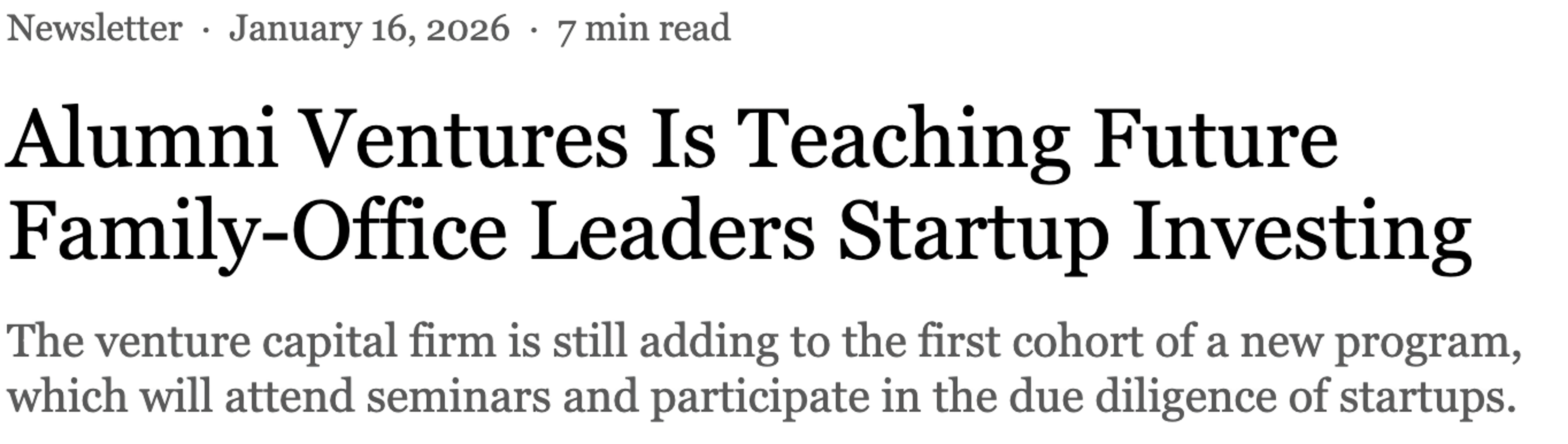 The Next Gen Program is built for emerging Family Office leadership (Generations 2–8) who want to learn venture capital the right way—by doing it. Each cohort of 15-20 gains education, mentorship, community (our Cohorts are global), and access to real deals, helping them develop judgment, confidence, and a sophisticated long-term investing mindset that applies well beyond venture capital.